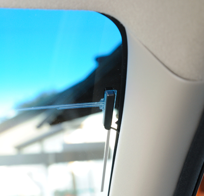 ↑VICSアンテナをフロントウィンドウに貼り付ける場合、機能上の問題からガラス面内に貼り付ける必要があるため