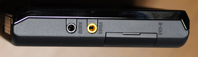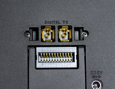 四角い端子はテレビ用フィルムアンテナ接続端子で、その下の口みたいな端子はクレードルとの接続端子となっている。