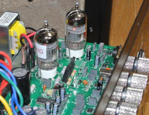 背面パネルを外し、アンプ内部を確認してみると、2本の小さな真空管が見える。