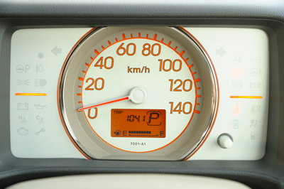 ↑スピードメーター下部には、オドメーターと燃料計、シフトポジション、外部温度などが液晶表示される。