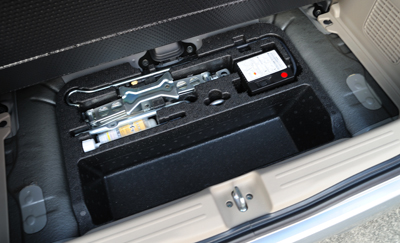 ↑荷室の床下にはジャッキとパンク修理用キットが納められている。
